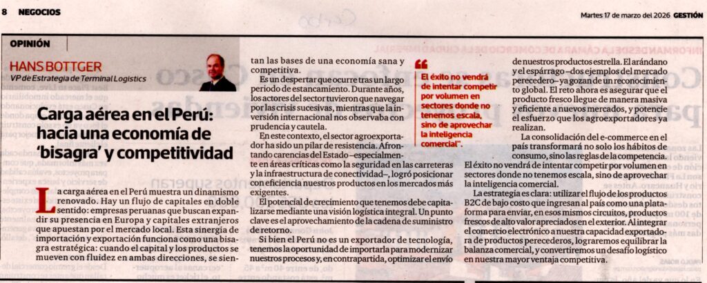 Carga áerea en el Perú: Hacia una economía de «bisagra» y competitividad Hans.Bottger.(17 de marzo del 2026). Carga aerea en el Perú:hacia una econmia de «bisagra» y competitividad.Diario Gestión