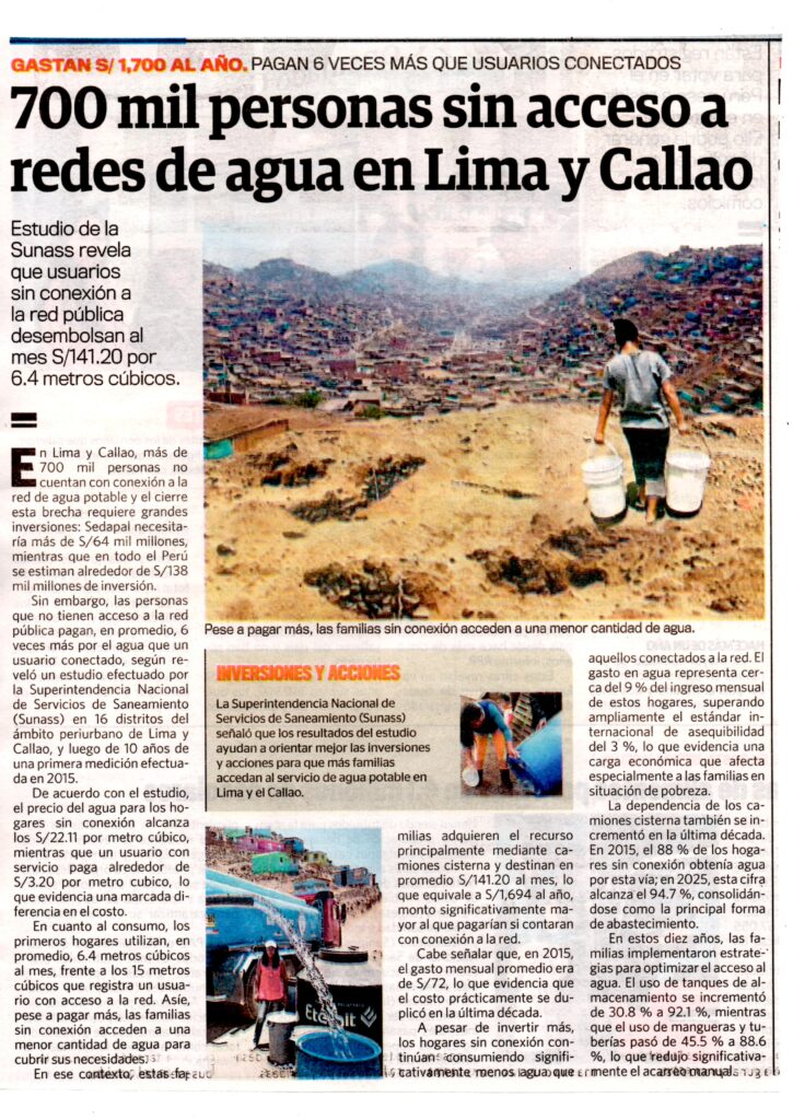 700 mil personas sin acceso a redes de agua en Lima y Callao