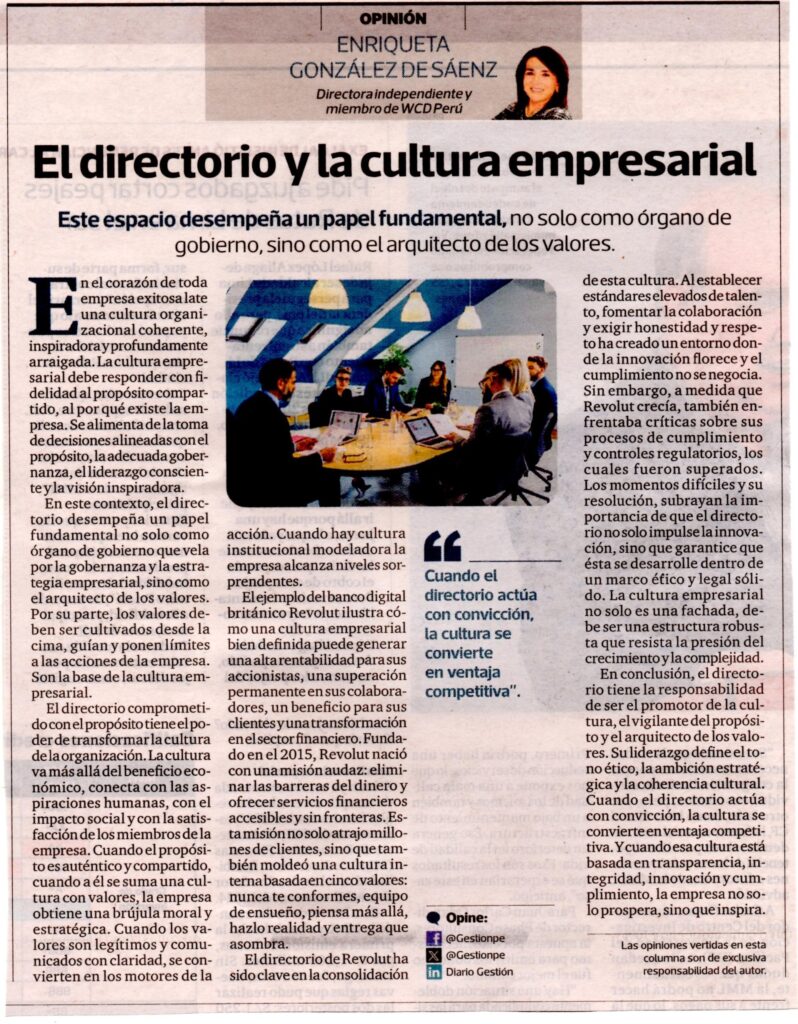 Fuente: Enriqueta González De Saénz . ( 14 de octubre del 2025). El Directorio y la cultura empresarial. Diario Gestión