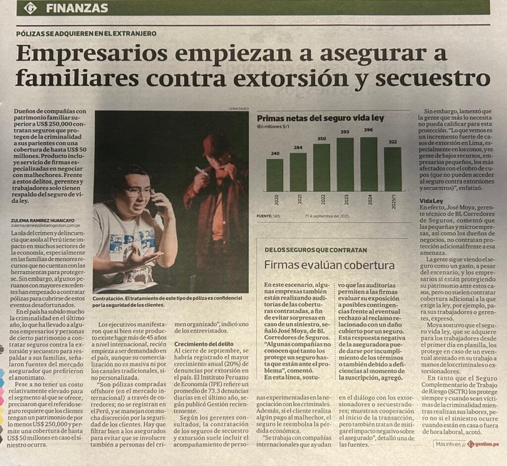 Empresarios empiezan a asegurar a familiares contra extorsión y secuestro Fuentes: Zulema Ramirez Huancayo. (29 de octubre del 2025).Empresarios empiezan a asegurar a familiares contra extorsión y secuestro. Diario Gestión