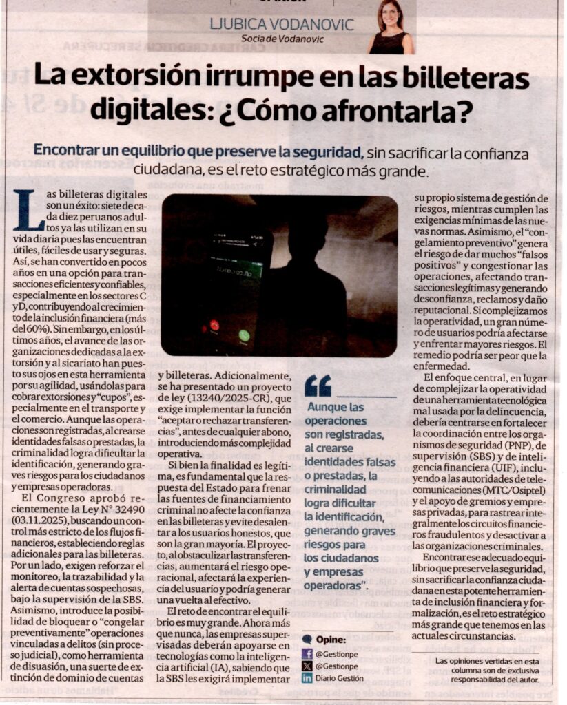 La extorsión irrumpe en las billeteras digitales:¿Cómo afrontarla? Opinión: Ljubica Vodanovic – Socia de Vodanovic Fuentes: Ljubica Vodanovic.( Viernes 12 de diciembre del 2025). La extorsión irrumpe en las billeteras digitales:¿Cómo afrontarla?.Diario Gestión