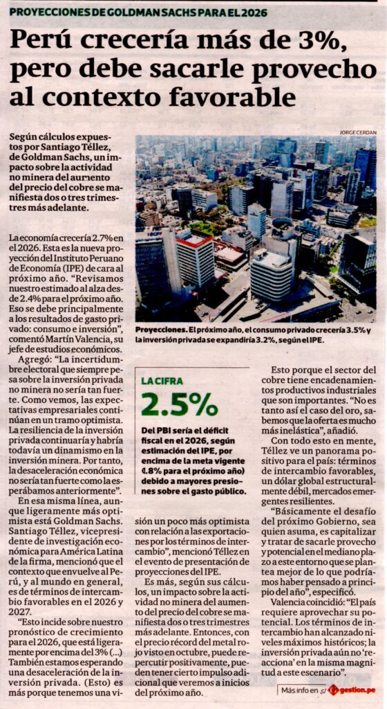 Perú crecería más de 3%, pero debe sacarle provecho al contexto favorable Fuente: Diario Gestión.( Miercoles 17 de dciembre de 2025). Perú crecería más de 3%, pero debe sacarle provecho al contexto favorable