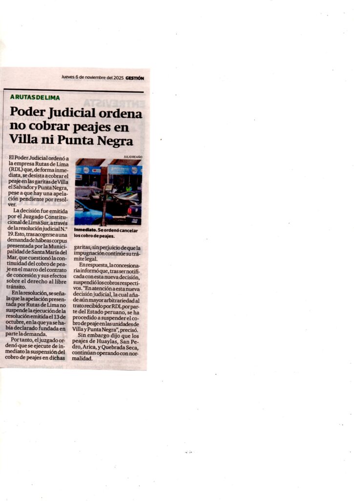 Poder Judicial ordena no cobrar peajes en Villa ni Punta negra Fuente: Diario Gestión.(06 de noviembre de 2025)Poder Judicial ordena no cobrar peajes en villa ni en punta negra