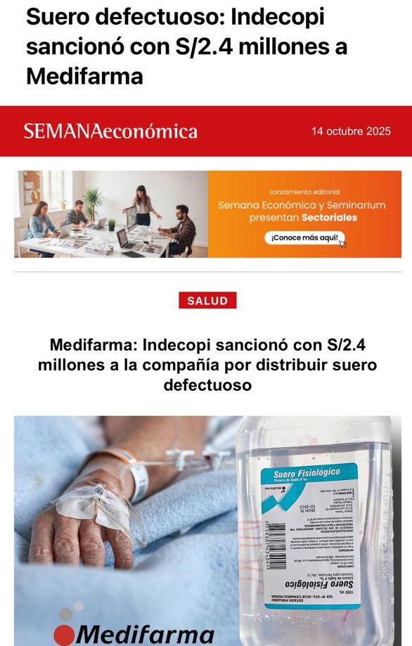 Suero defectuoso: Indecopi sancionó con S/2.4 millones a Medifarma Fuente: SEMANAeconómica.(14 de octubre del 2025).Medifarma: Indecopi sancionó con S/2.4 millones a la compañia por distribuir suero defectuoso