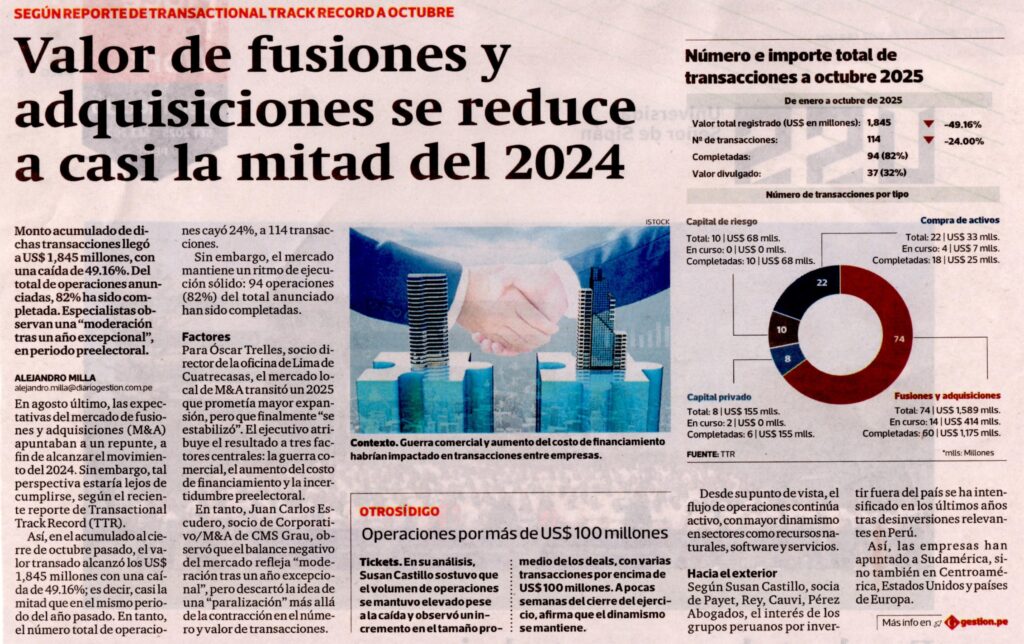 Valor de fusiones y adquisiciones se reduce a casi la mitad del 2024 Fuentes: Alejandro Milla.(Viernes 12 de diciembre del 2025). Valor de fusiones y adquisiciones se reduce a casi la mitad del 2024). Diario Gestión